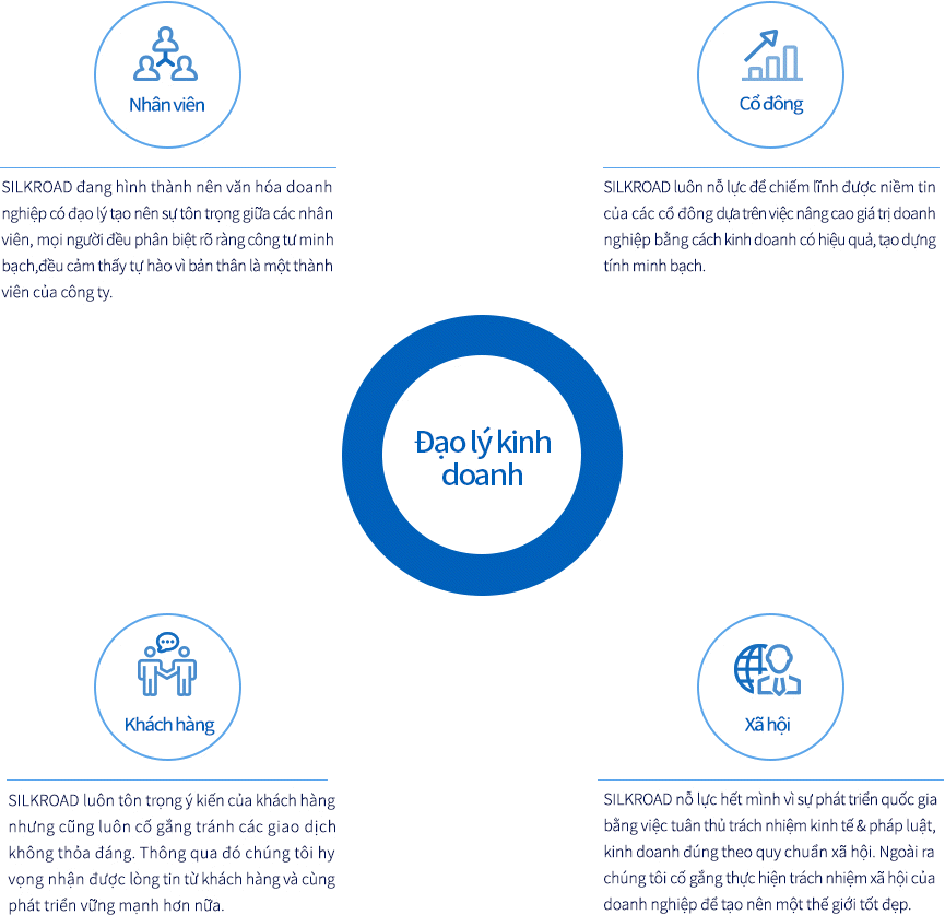 Tất cả các nhân viên của SILKROAD nỗ lực tuân thủ các quy tắc đạo đức, pháp luật bằng hoạt động kinh doanh 1 cách có đạo lý. Chúng tôi cũng đang triển khai không ngừng các hoạt động hướng đến kinh doanh có đạo lý như tiến hành xây dựng và đào tạo hệ thống giúp hình thành nên nhận thức giá trị quan đúng đắn và cách ứng xử đúng mực.